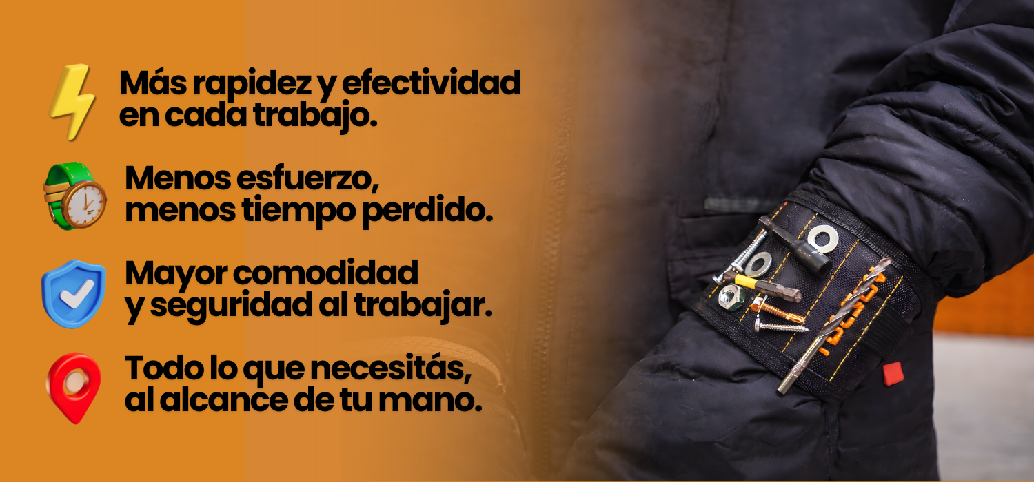 Cuenta con 6 imanes extra fuertes integrados, capaces de sostener tornillos, tuercas, arandelas, clavos, mechas y llaves livianas de forma firme y visible, incluso en posiciones incómodas o trabajos en altura.